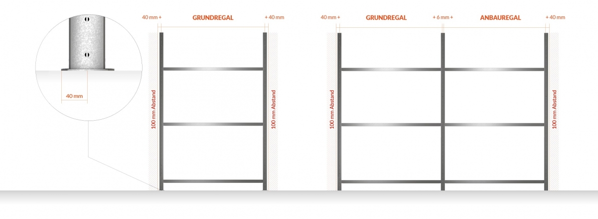 • um die Gesamtlänge der Installation zu berechnen, muss man zu der ausgewählten Breite für das Grundregal 80 mm und für jedes Anbauregal in der Regalreihe 6 mm hinzuaddieren. Weiterhin ist es notwendig, dass Sie bei beiden Regalen zu der ausgewählten Tiefe 36 mm zusätzlich einplanen.​ Außerdem wird empfohlen am Anfang und am Ende des Regals einen Abstand von 100 mm vorzusehen, um mögliche Unregelmäßigkeiten im Boden und an den Wänden zu vermeiden.