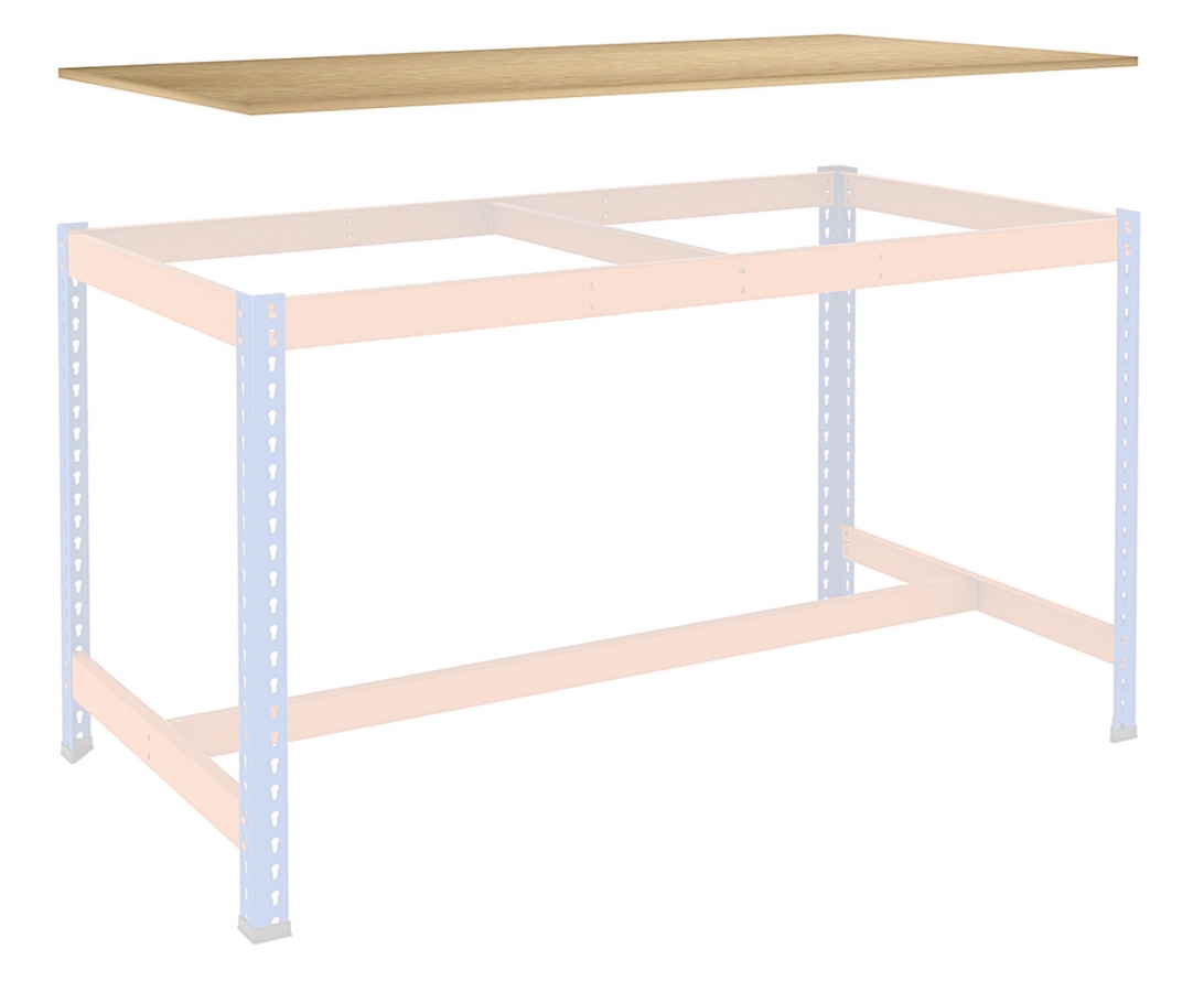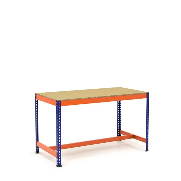 Unsere individuellen Arbeitstische mit Fußstütze können Sie ohne Schrauben aufbauen. Sie stecken lediglich die Einzelteile zusammen und klopfen diese mit einem Gummihammer fest. Als zusätzliche Sicherheitsmaßnahme ist der Tisch mit einer zentralen Traverse verstärkt. Bei den Tischplatten können Sie zwischen Spanplatten oder weißem Melamin (ohne Kantenschutz) wählen. Beide Varianten sind sehr robust, wobei die beidseitige Melaminbeschichtung ebenso wie die Epoxyfarbe an den Metallelementen für eine höhere Widerstandsfähigkeit sorgt.