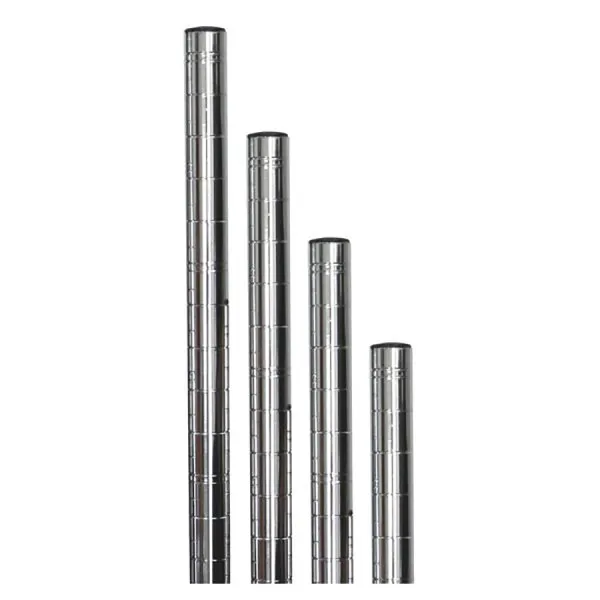 Jeder verchromte Stahlpfosten hat einen stabilen, höhenverstellbaren Fuß. Dadurch können Sie Unebenheiten sowie Unregelmäßigkeiten des Fußbodens problemlos ausgleichen. Wenn Sie bei Ractem ein bewegliches Regal kaufen wollen, können Sie statt der Füße auch Rollen bestellen und diese an die Pfosten montieren. In diesem Fall empfehlen wir Ihnen, ebenfalls einen Blick auf die Gummi-Schutzvorrichtungen für Rollen zu werfen. Diese schützen die Modelle vor Kratzern und anderen Schäden.