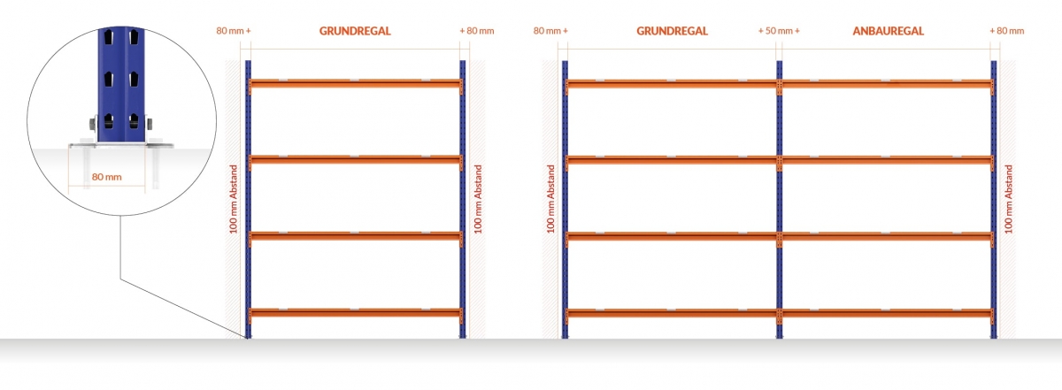 Bedenken Sie beim Kauf unserer Pickingregale, dass sowohl das Grund- als auch das Anbauregal dieselbe Tiefe haben müssen! Ansonsten sind beide Einheiten nicht miteinander kompatibel. Außerdem wird empfohlen am Anfang und am Ende des Regals einen Abstand von 100 mm vorzusehen, um mögliche Unregelmäßigkeiten im Boden und an den Wänden zu vermeiden.